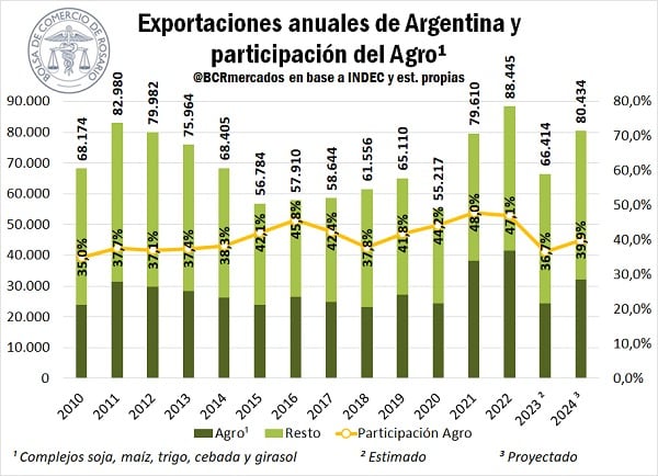 Según un estudio de la Bolsa de Comercio de Rosario (BCR), las exportaciones de los principales complejos granarios podrían alcanzar los USD 32.109 millones en 2024 si se consideran las estimaciones actuales de intención de siembra, los rindes tendenciales para estimar producción y los precios FOB vigentes para embarque en el próximo año. Si se concreta ese panorama, las exportaciones de los complejos de soja, maíz, trigo, girasol y cebada sumarían en conjunto unos USD 8.000 millones más que los USD 24.000 millones estimados para el presente año, lo que equivale a un salto del 33% interanual.