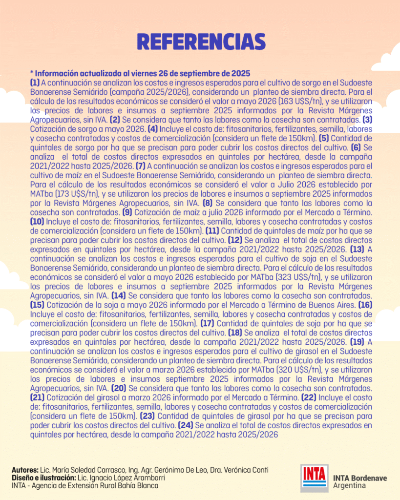 En el presente informe, realizado por la Licenciada María Soledad Carrasco, Ing. Agr. Gerónimo De Leo y la Dra. Verónica Conti, se analizan los costos e ingresos estimados para los cultivos de sorgo, maíz, soja y girasol en la campaña 2025/2026, teniendo en consideración un planteo productivo del Sudoeste Bonaerense Semiárido.