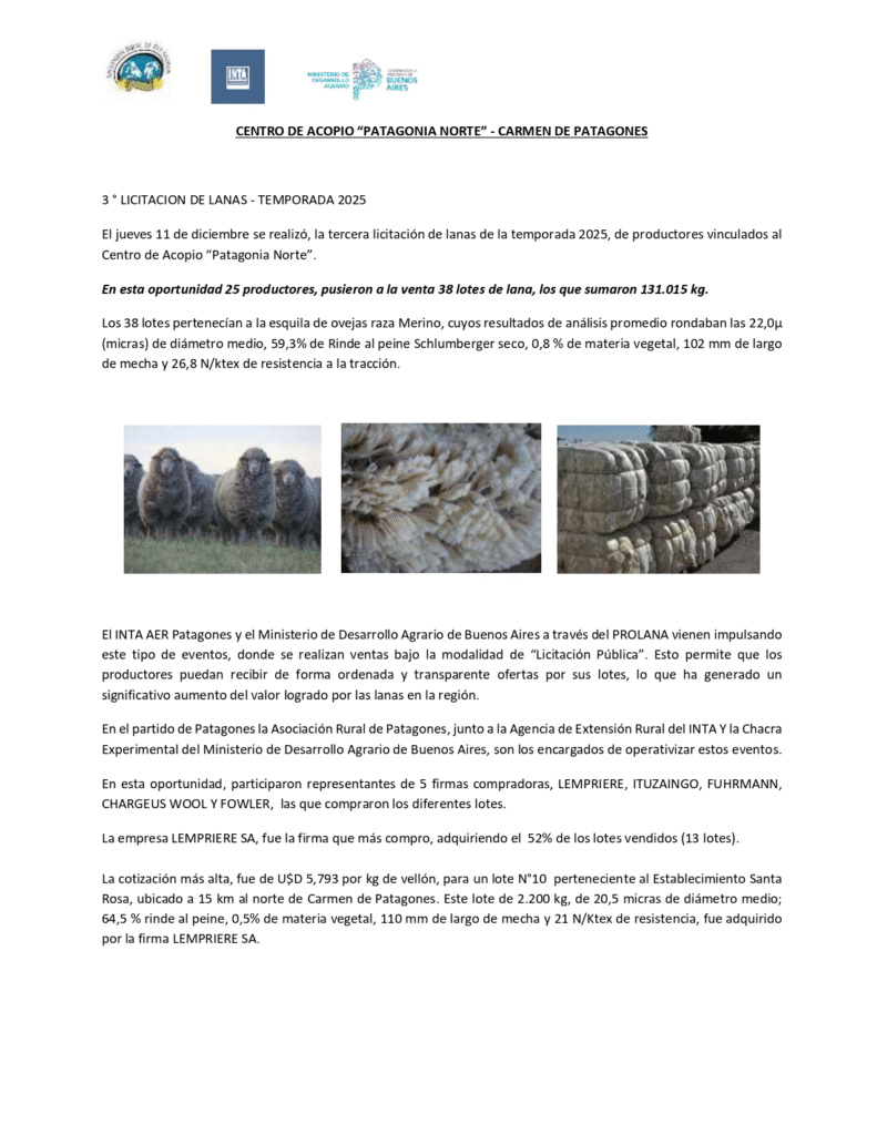 El pasado jueves 11 de diciembre se realizó la tercera licitación de lanas de la temporada 2025 de productores vinculados al Centro de Acopio “Patagonia Norte”.