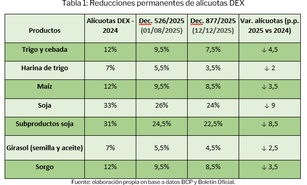 El pasado 12/12, con la publicación del Decreto 877/2025 en el Boletín Oficial, se oficializó una nueva rebaja en las alícuotas de los derechos de exportación (DEX) que gravan a los granos, derivados y subproductos. Se trata de la segunda reducción permanente definida por el gobierno nacional durante 2025. Ambas medidas estuvieron precedidas por otras que establecieron modificaciones temporales de los DEX, como la reducción al 0% definida en septiembre pasado, cuya vigencia fue de 48 horas tras alcanzar el cupo de u$s 7.000 millones de exportaciones declaradas.