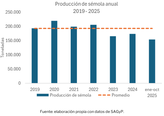 Durante el período enero-octubre de 2025, el valor FOB promedio de la sémola se ubicó en 591,3 u$s/Tn. Considerando la alícuota del 4% que regía en dicho período, los DEX estarían valuados en 23,65 u$s/Tn, lo que ahora debería reducirse a la mitad (11,8 u$s/Tn). En términos monetarios, y teniendo en cuenta el promedio de exportaciones de sémola de los últimos 5 años, el impacto fiscal de la medida estaría valuado en u$s 244.484.