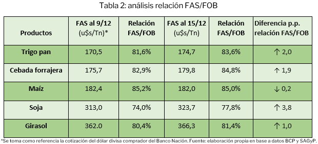 Tanto en trigo, como en cebada y girasol, al momento de comparar los precios FOB vigentes el día del anuncio del cambio en los DEX (9/12) con los del 15/12, no se registraron variaciones. De esta manera, las mejoras en la relación FAS/FOB observadas en la tabla podrían atribuirse a la última baja permanente de DEX oficializada el pasado viernes.