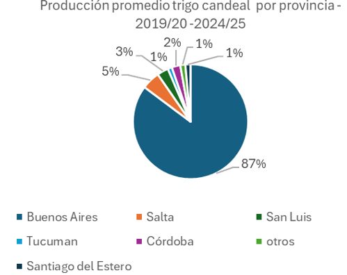 Según SAGyP, entre las campañas 2019/20 y 2024/25, la producción nacional promedio de candeal fue de 301.842 Tn. La mayor producción se concentra en la provincia de Buenos Aires con el 87%, seguido por Salta y San Luis con el 5% y 3%, respectivamente.