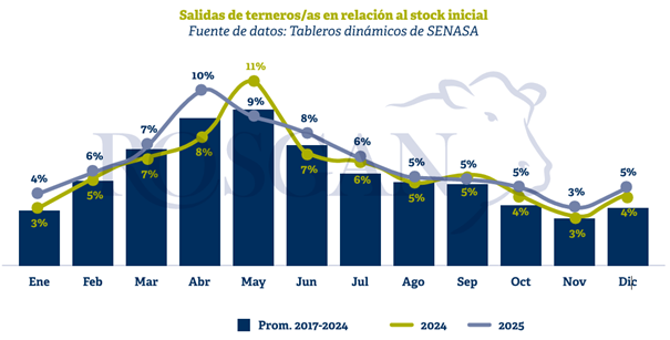 En comparación con años anteriores, 2025 fue el año de mayor movimiento relativo de terneros, superando el 67% que representa el promedio de los últimos ocho años. Asimismo, el mes de mayor salida se registró en abril, aproximadamente un mes antes de lo habitual, lo que estuvo incentivado por la buena condición de la hacienda y por los muy buenos precios que comenzaba a registrar la invernada, aún en plena zafra.