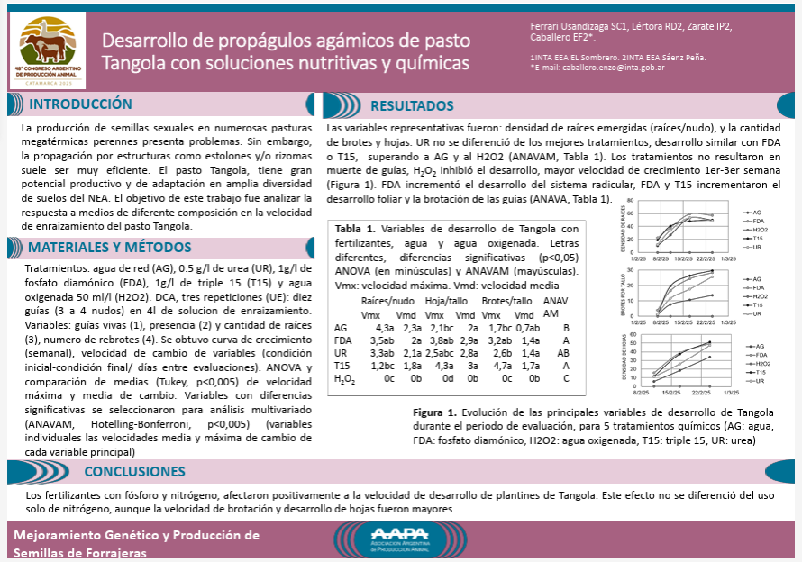 Desarrollo de propágulos agámicos de pasto Tangola con soluciones nutritivas y químicas, es un trabajo de investigación realizado por los profesionales del INTA EEA Corrientes, Silvana Ferrari Usandizaga y Enzo Caballero; y por los profesionales de la EEA Saenz Peña Lértora R. D. y Zarate I. P.; y además fue presentado en el 48º Congreso Argentino de Producción Animal.