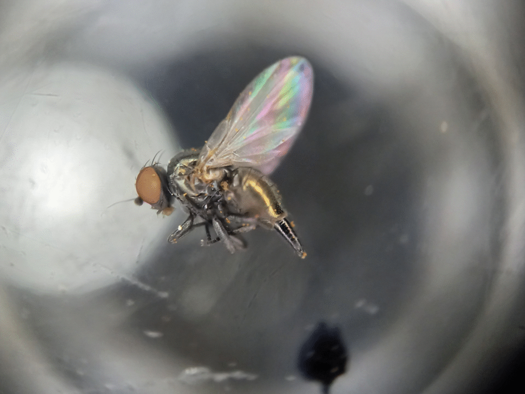 En el Valle de Riego Bonaerense del Río Colorado, se observó la presencia de la Mosquita del Capítulo del girasol, Melanagromyza minimoides Spencer. Este pequeño díptero forma parte de la entomofauna local. Está presente en el cultivo de girasol y tiene como huéspedes alternativos plantas compuestas de la familia Asteraceae (Valladares, 1982), que se caracterizan por tener flores en capítulos.