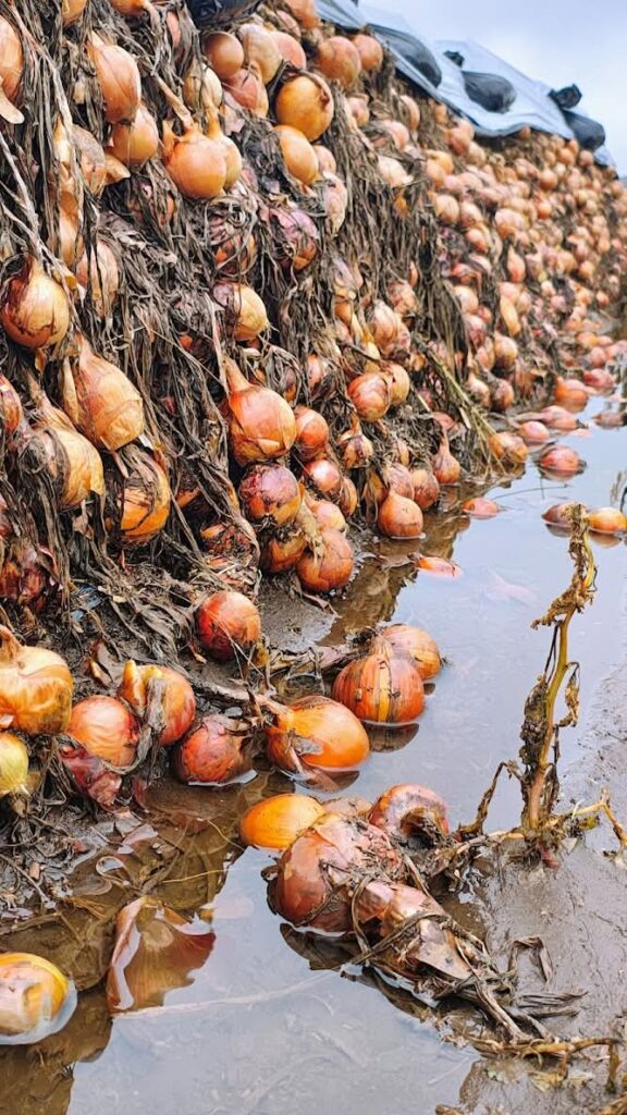 Las lluvias excepcionales del 31 de marzo, con más de 100 mm acumulados en pocas horas, provocaron anegamientos en lotes de cebolla apilada en el valle bonaerense del río Colorado.