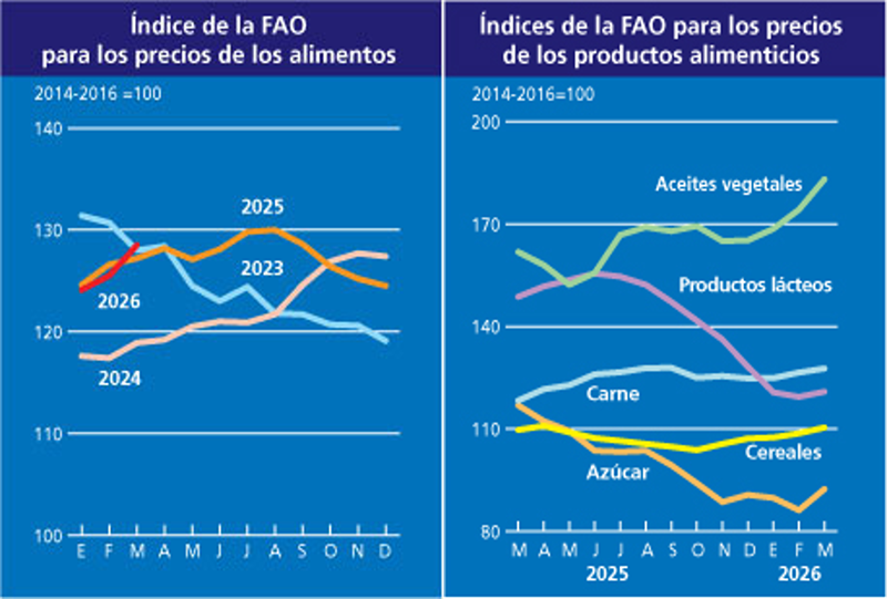 El índice de precios de los productos lácteos de la FAO (Organización de las Naciones Unidas para la Alimentación y la Agricultura) se situó en un promedio de 120,9 puntos, lo que supone un aumento de 1,5 puntos (un 1,2 %) en marzo, pero se mantuvo 27,8 puntos (un 18,7 %) por debajo del nivel registrado el año anterior.